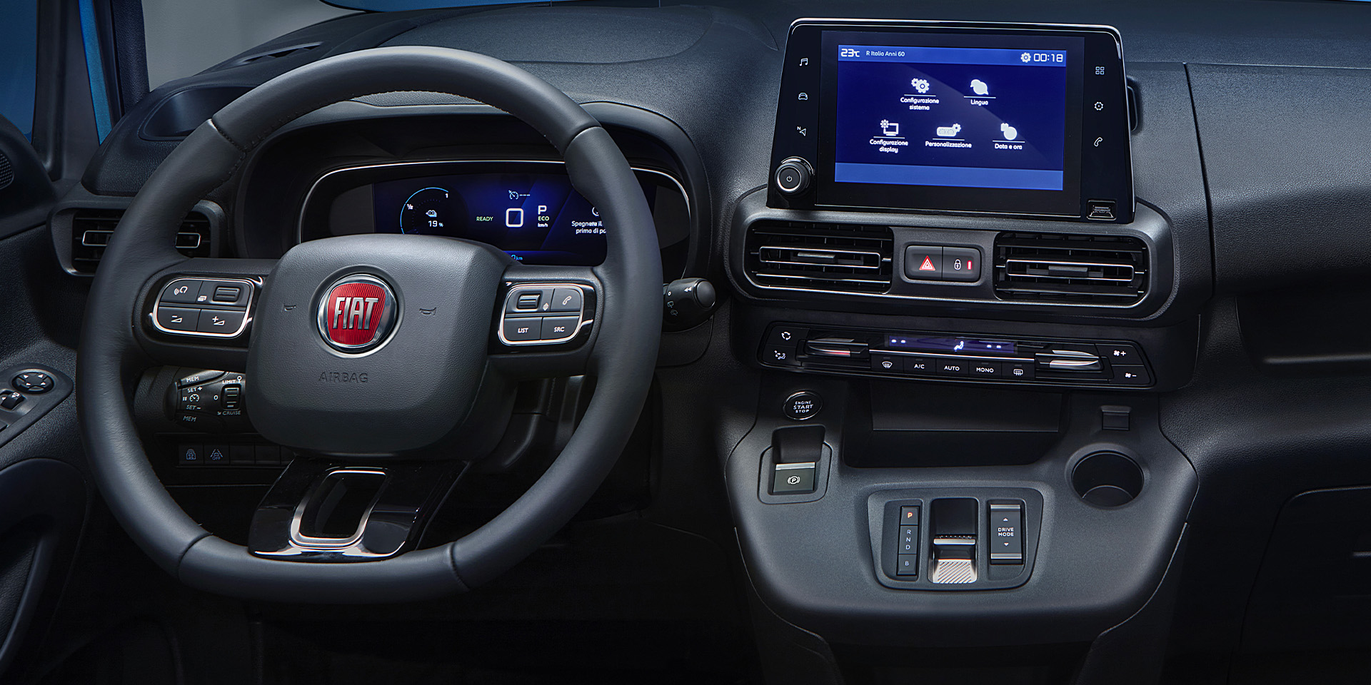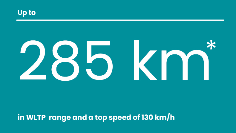 The new Fiat E-Doblò has a 50 kWh Battery and 100kW engine power, top in the segment, capable of ensuring autonomy up to 285km in WLTP range and a top speed of 130 km/h with zero emissions.Typography