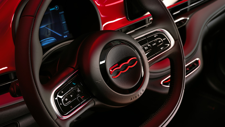 In its interior you’ll find fabric seats black fabric made from recycled pet with Fiat Monogram and red seams. In addition, you'll be able to adjust and regulate them in 4-way. A dedicated painted logo with the 500 classic badge enriches the premium black steering wheel, reshaped to recall the iconic style of the two-spoke ’57 Fiat 500.